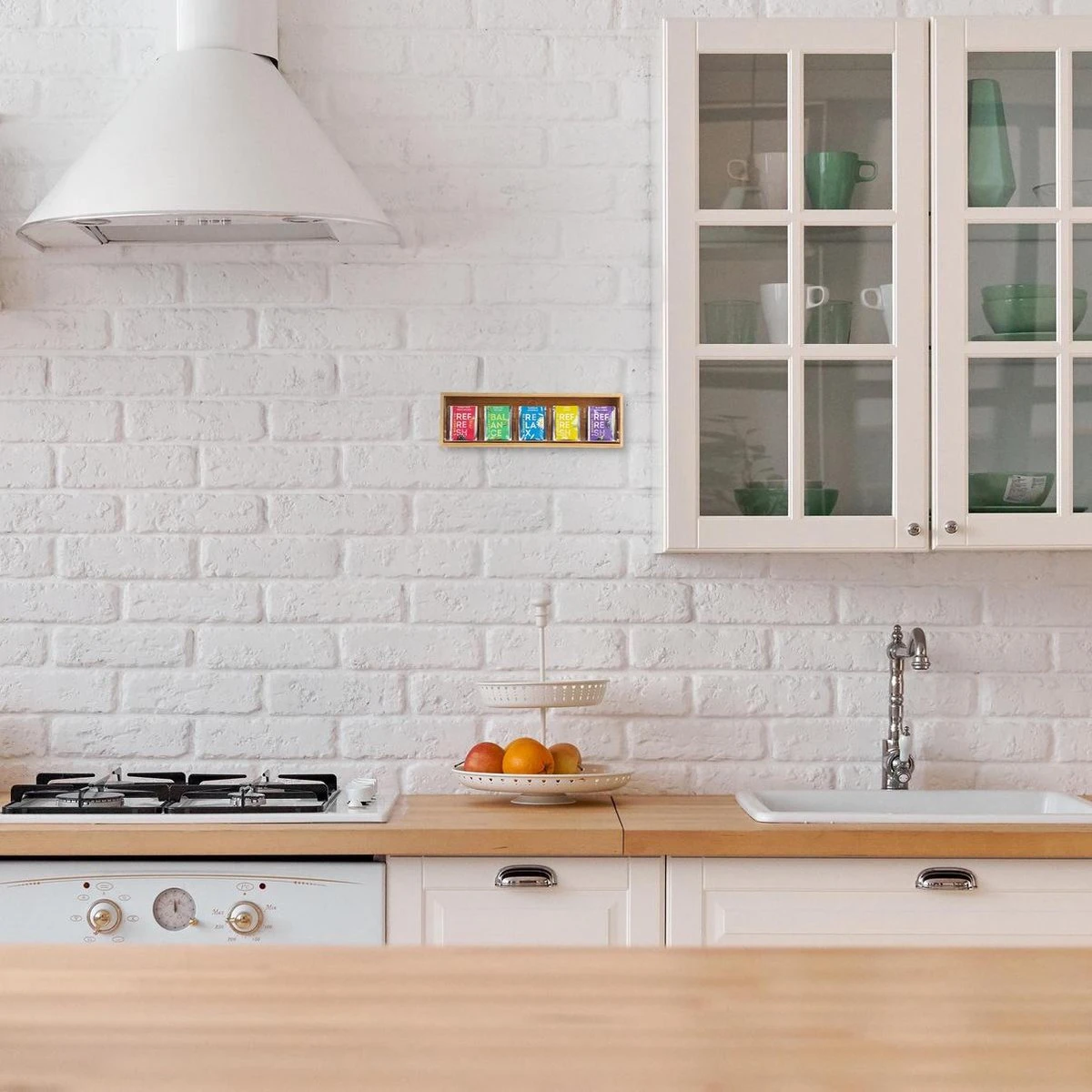 De theedoos van bamboe is de ideale keukenaccessoire voor alle theeliefhebbers! In deze praktische opbergdoos voor thee kun je al je favoriete theesoorten droog en met behoud van aroma bewaren. In de 5 ruime vakken van het theedoosje passen ongeveer 10 theezakjes per compartiment. Dankzij de transparante deksel heb je altijd een goed overzicht over de theesoorten. De houder voor theezakjes wordt ruimtebesparend aan de wand gemonteerd waardoor je altijd snel bij je thee kunt komen.