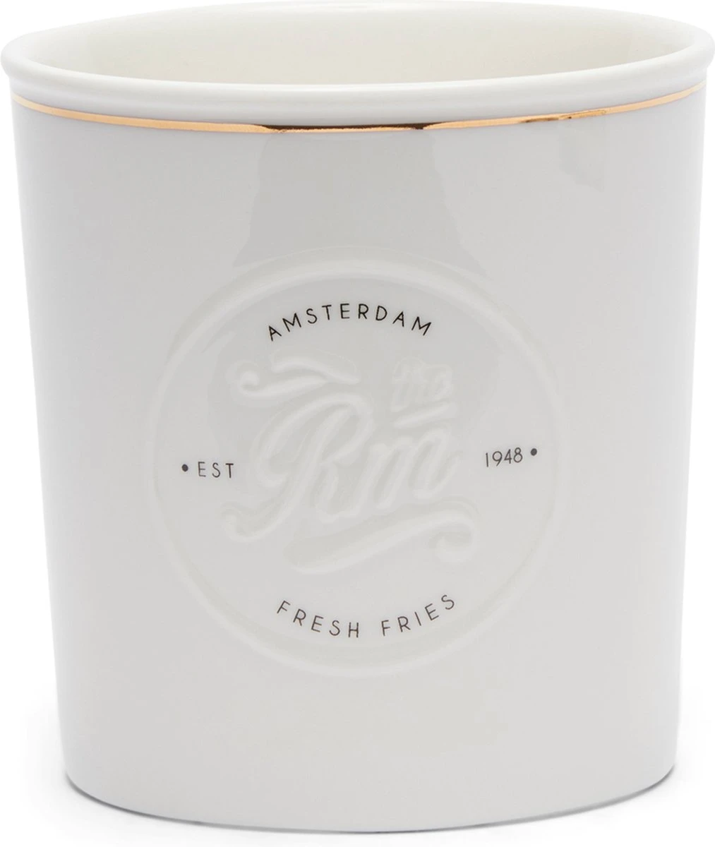 Wat een heerlijke schaal om je frietjes in te serveren, deze RM French Fries Serving Bowl. Afgebiesd met een gouden randje (niet in de vaatwasser) en een mooi RM in reliëf. Hier willen de patatten wel enthousiast rechtop in staan. Met de hand afwassen.