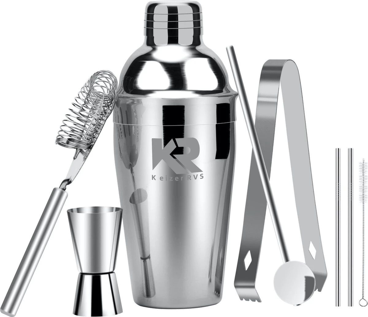 Met deze 5 delige roestvrijstalen cocktailshaker set zijn alle cocktails en drankjes makkelijk thuis te maken. Door de hoge kwaliteit heeft u jaren lang plezier van deze cocktailshaker set. De meeste producten zijn gemaakt van 201 roestvrijstaal, een goedkopere staal soort dan deze hoge kwaliteit 304 roestvrijstalen cocktailshaker set.