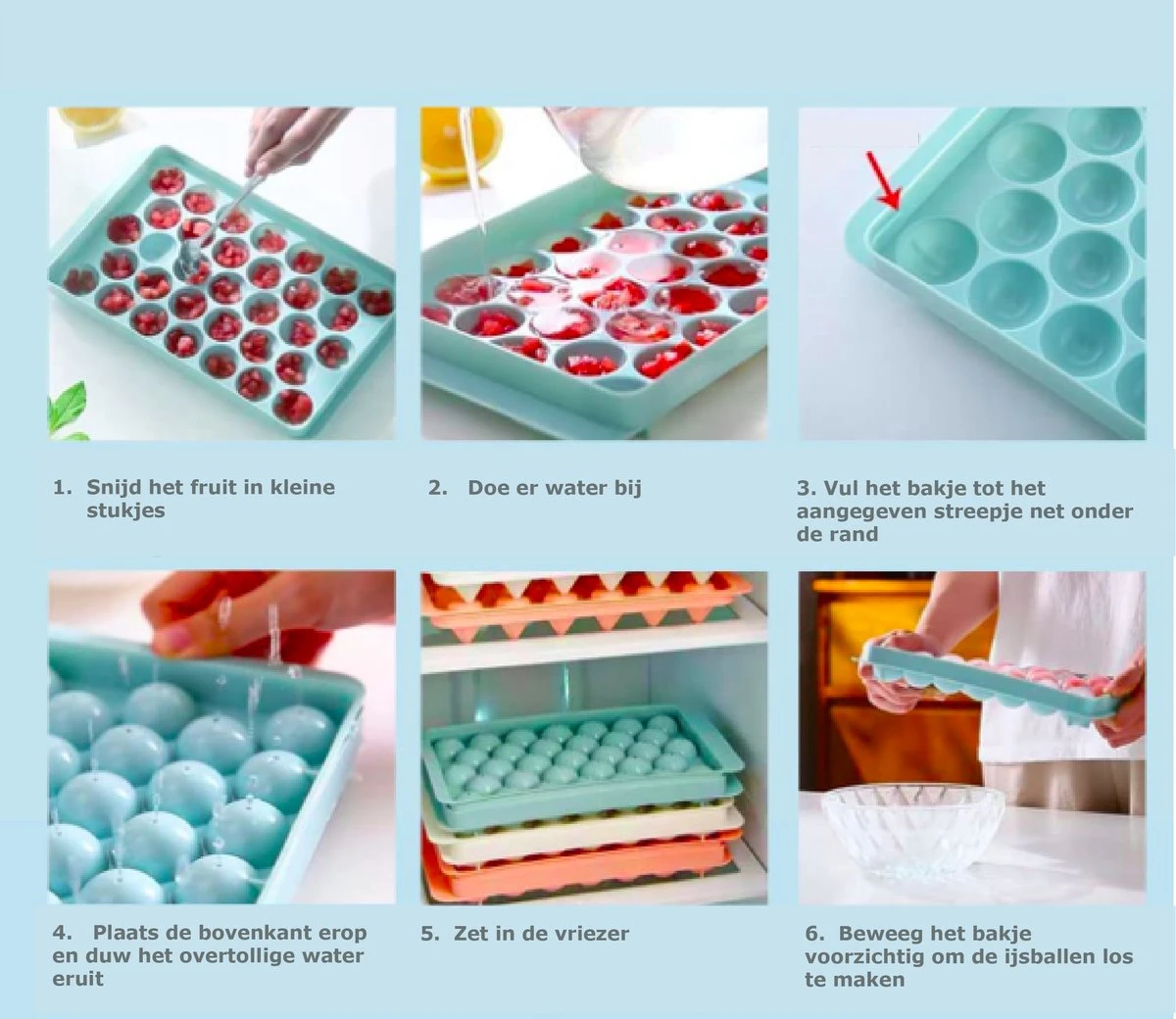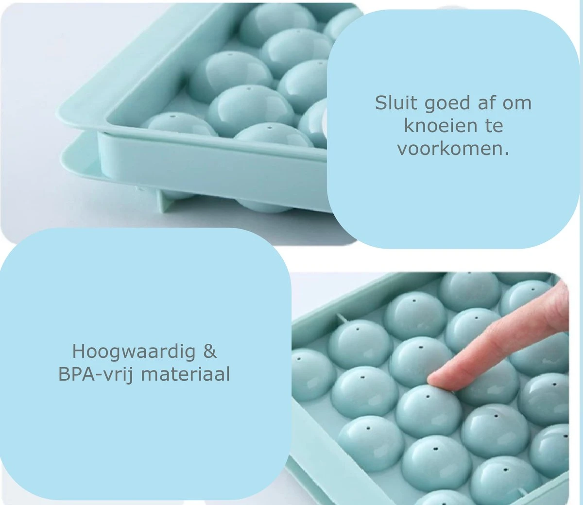Set van twee ronde ijsblokjesvormen, 33 ronde ijsblokjes per stuk. Ronde ijsblokjes blijven langer bevroren dan normale ijsblokjes. De ijsblokjesvormen van NAM life goods zijn gemaakt van hoogwaardig, BPA-vrij kunststof. De ijsblokjesvormen zijn duurzaam en vaatwasserbestendig. De bakjes sluiten goed af, waardoor je knoeien met water voorkomt en zijn daarnaast makkelijk op te stapelen in het vriesvak.