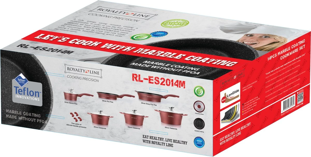 Royalty Line – Set Lot 14-delige Pannenset Inductie – Glazen Deksel – Met Afneembare Handgreep – Marmeren Interieur -PFAS-vrij – Roze Kleur