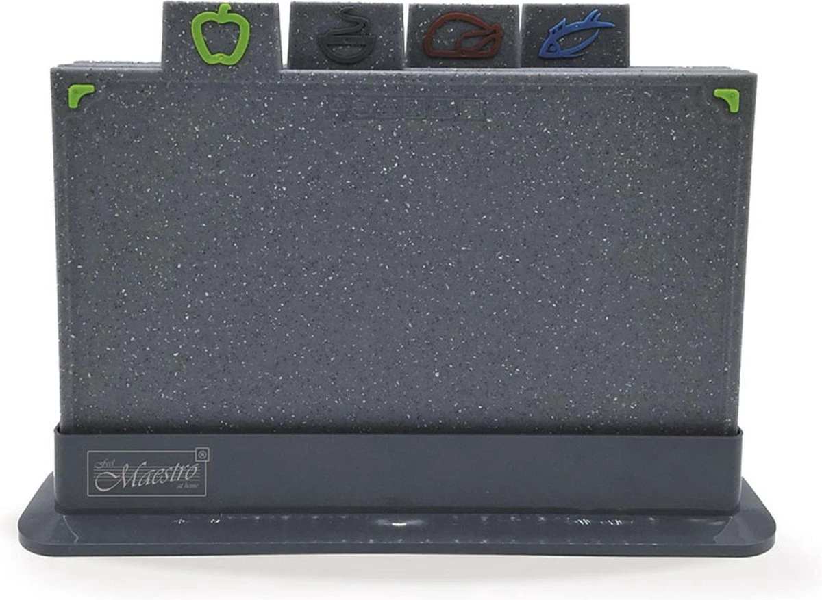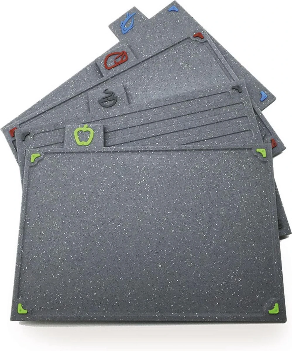 Een set van vier rechthoekige dubbelzijdige borden voor verschillende soorten producten. Zo kunt u voorkomen dat gesneden gerechten de smaak van ander voedsel overnemen!