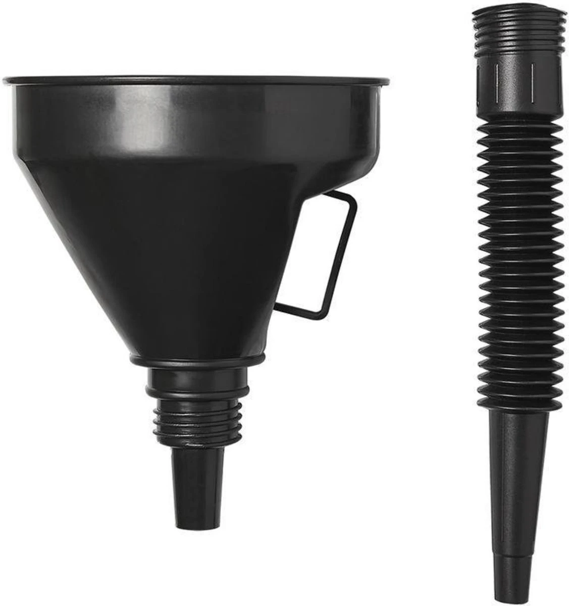 Stevige professionele plastic trechter met flexibele tuit en zeef, met name handig voor het bijvullen van vloeistoffen zoals brandstof en olie op moeilijk bereikbare plaatsen.