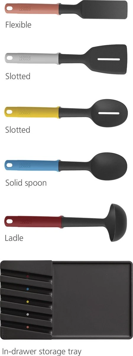 Met de Elevate Store Keukenhulp set van Joseph Joseph houd je al jouw favoriete lepels en spatels binnen handbereik! Bewaar de 5 keukenhulpjes in de liggende houder in de keukenlade om enorm veel ruimte op het aanrecht te besparen. De set bestaat uit een liggende houder, een soeplepel, een gleuflepel, een opscheplepel, een lange spatel en een gleufspatel. Alle lepels en spatels binnen deze set hebben een geïntegreerde leunstandaard en een verzwaard handvat waardoor je ze kan neerleggen zonder dat deze het aanrecht aanraken. Verder bestaat de kop van ieder keukenhulpje uit nylon welke verhit kan worden tot 270 °C. De ergonomische siliconen handvatten zijn echter hittebestendig tot 200 °C. Na gebruik kunnen alle lepels en spatels worden schoongemaakt in de vaatwasser.