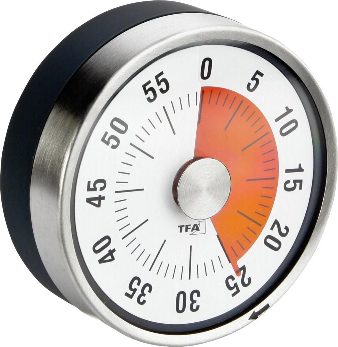 Deze mechanische kookwekker van TFA krijgt een handig rood vlak, als je de tijd instelt. Hierdoor kun je ook gemakkelijk van een afstandje zien of de tijd al bijna voorbij is. Als de tijd voorbij is, is het rode vlak verdwenen.Je draait de kookwekker op, dus het batterijtje kan nooit leeg zijn. Aan de achterkant bevindt zich een magneet, hierdoor kun je de kookwekker ook op de afzuigkap of koelkast plakken als je dat handig vindt.