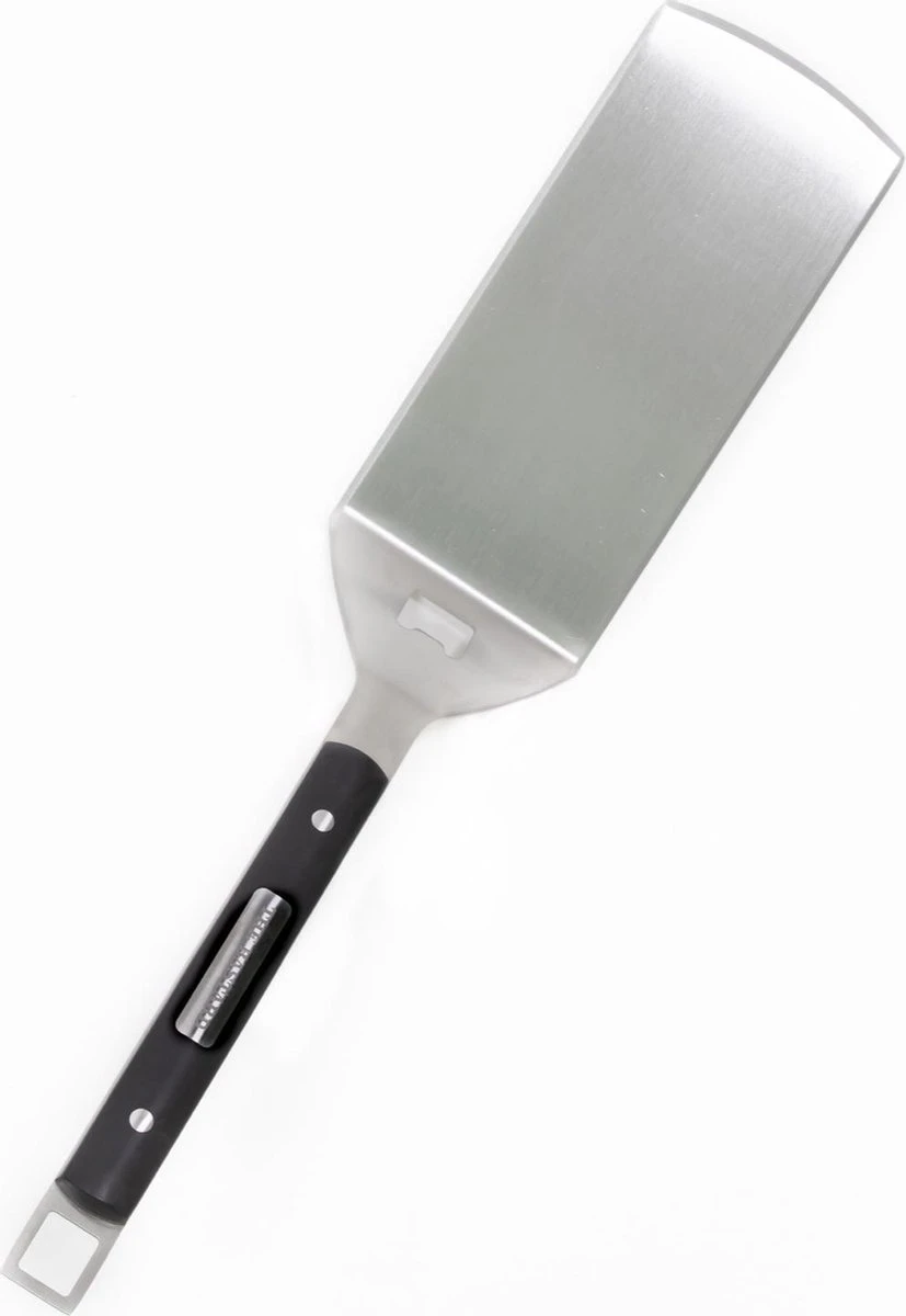 Hamburger flipper waarmee je veilig in één hand omdraai jouw perfecte burger flipt. Ook een handige tool voor al je barbecue gerechten en om een biertje mee te openen. RVS flipper met robuust zwarten handvat.