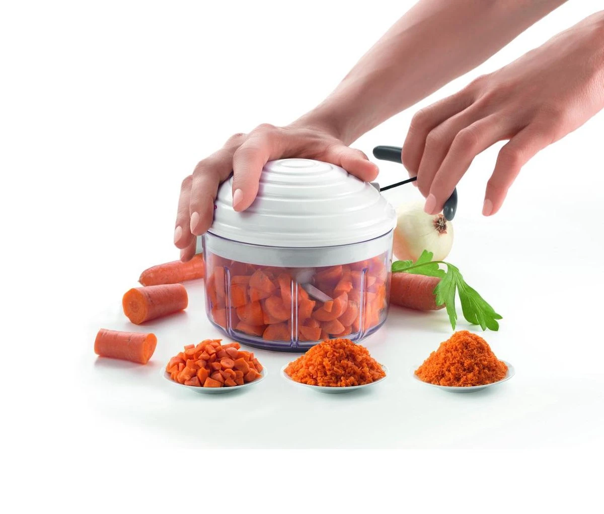 Rotomac van Metaltex is een revolutionaire hakker met beweegbare messen. Snijdt in enkele seconden van grof tot fijn. Eenvoudig in gebruik en snel bij het bereiden van soepen, sauzen, tapenades, pesto’s enz. Rotomac werkt zonder electriciteit of batterij. De mesjes werken enkel door het trekken aan een stevig touw met handvat. Je kunt alles, behalve het deksel, in de vaatwasmachine stoppen. Het deksel kan met een vochtig doekje schoon gemaakt worden. Swiss Design, Invention & Technology. 2 jaar garantie.