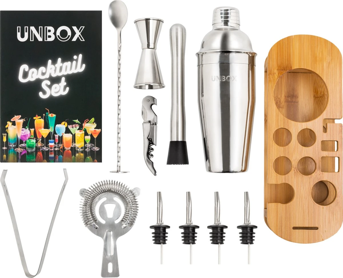 Deze luxe cocktailset van UNBOX is het unieke cadeau voor de enthousiaste bartender, beginner of hobbyist. De cocktail set bevat alles wat je nodig hebt van zeef tot aan stampers tot aan een echte shaker en zelfs een cocktail boekje. De cocktail set is gemaakt van hoogwaardig RVS materiaal, hierdoor is hij een echte toevoeging op elke gelegenheid!
