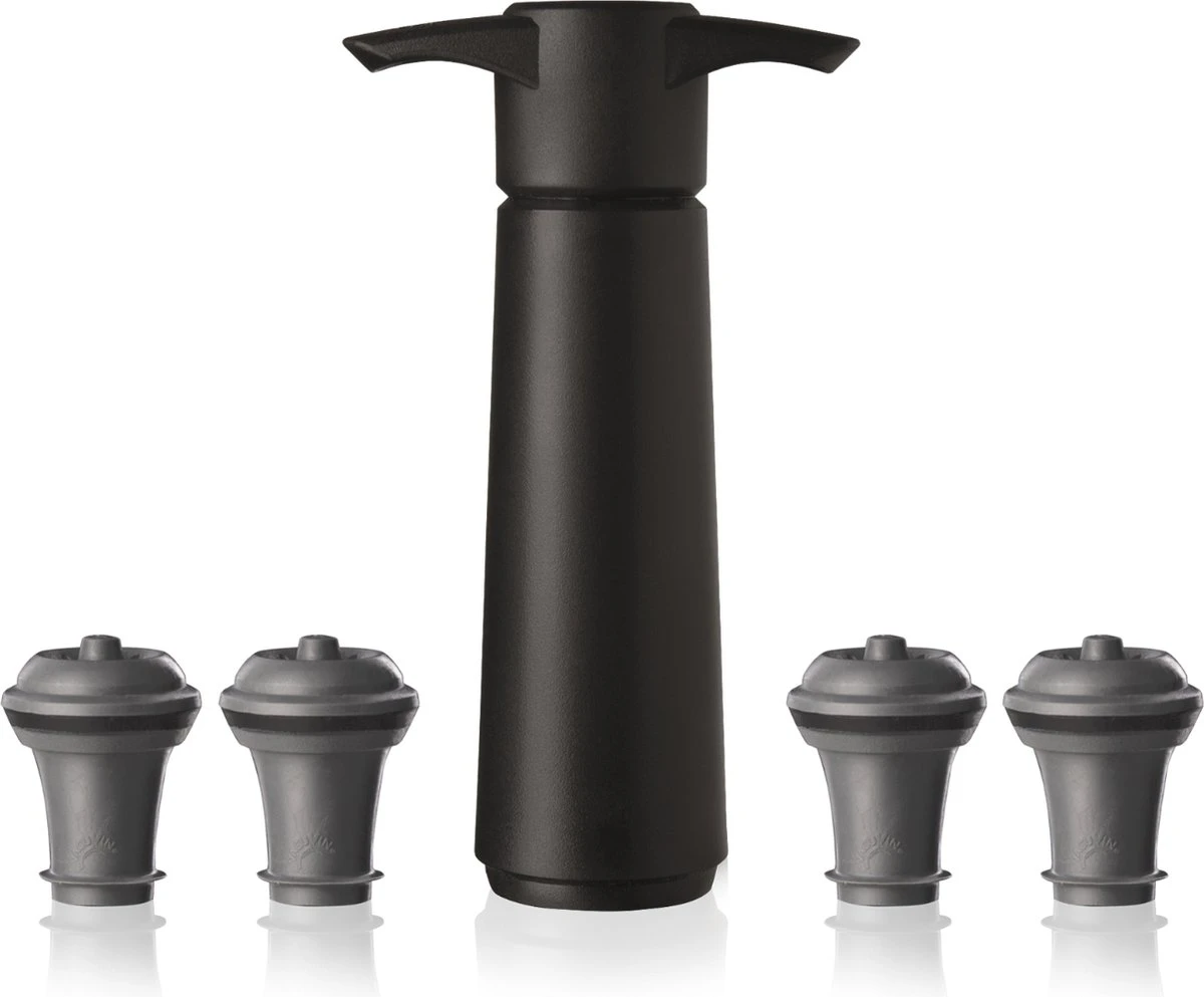 Met de Vacu Vin Wijnpomp Wine Saver met 4 wijnstoppers in de kleur Zwart kan wijn worden afgesloten. De wijnpomp haalt met behulp van de Vacu Vin wijnstopper de zuurstof uit de wijnfles. De wijnfles is vacuum na het horen van een klik geluid. Hierdoor kan de wijn tot 10 dagen worden bewaard, nadat de wijn is geopend. Met deze wijnpomp gaat de wijn minder snel oxideren en blijft de wijn langer goed.