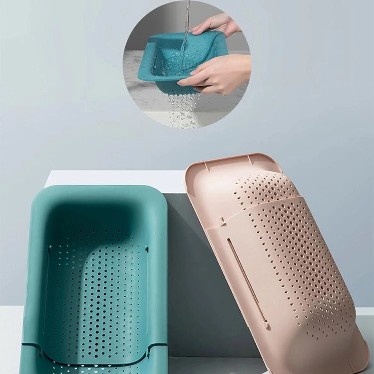 De vergiet kan in lengte versteld worden zodat deze geschikt is voor elk type gootsteen. Het is namelijk wel zo hygiënisch om de vergiet boven de gootsteen te laten hangen. De minimale lengte is 362 mm, deze kan worden versteld naar maximaal 494 mm en alle afmetingen die hier tussen zitten. Het kan dus niet anders dan dat deze vergiet perfect past in jouw gootsteen.