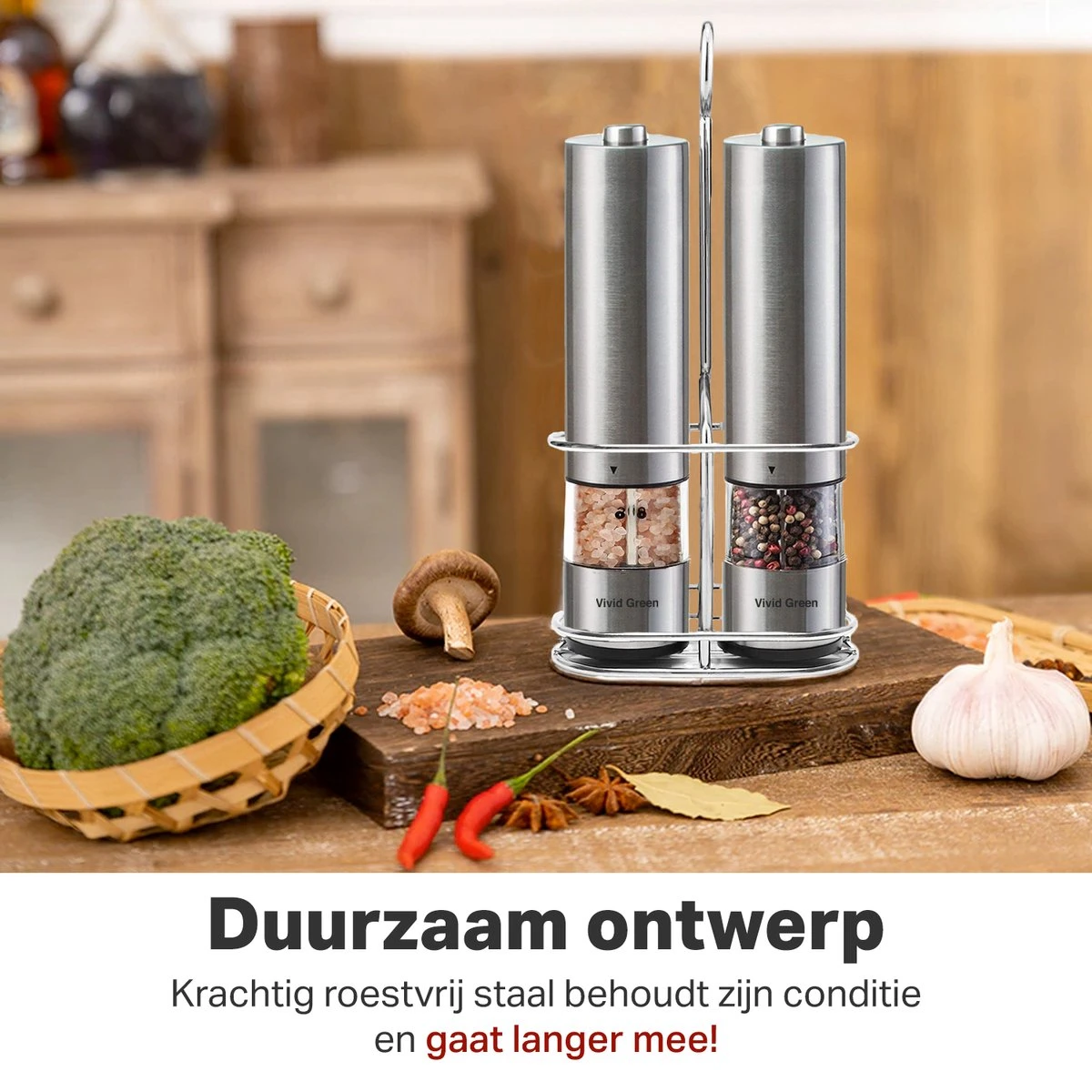 De buitenkant van de Peper- en Zoutmolen is van duurzaam roestvrijstaal en geeft een stijlvolle uitstraling in iedere keuken. Door de meegeleverde houder kan je de molens netjes opbergen.