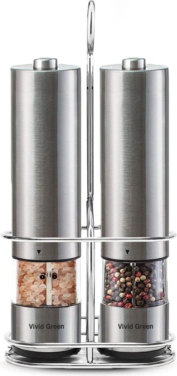 ✔Inhoud: 1x Elektrische Peper- en zoutmolen – 1x Stalen houder – 2x Siliconen afdekklepje – 1x Schoonmaaktool – 1x Trechter – 1x Digitale handleiding