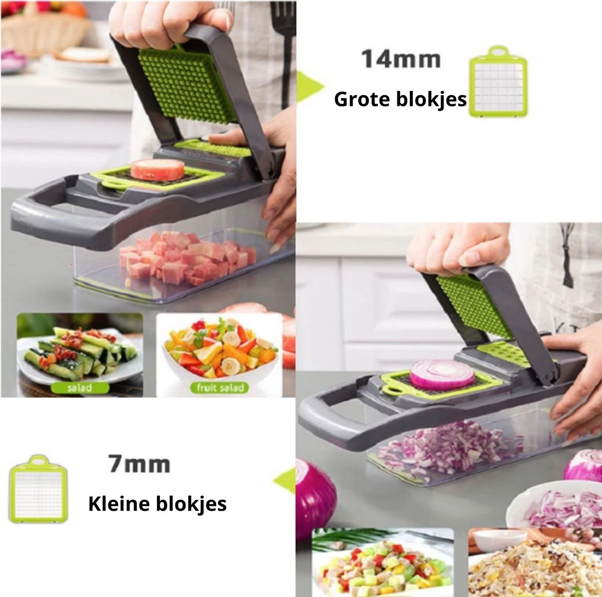 Wil je tijd besparen met voorbereiden van je eten? Deze W&Z mandoline/groentesnijder is multifunctioneel. Hij zorgt ervoor dat je al je fruit en groente of ander voedsel kan snijden in een snelle en makkelijke manier. Deze W&Z 16-delige set is gemakkelijk weer op te bergen en is makkelijk schoon te maken. Door de scherpe, roestvrijstalen messen snijd je moeiteloos kleine stukjes groenten en/of fruit. Daarbij heb je de keuze om te snijden in kleine of grote blokjes. Alles wat je snijdt of raspt komt netjes in een opvangbak terecht zodat je aanrecht schoon blijft. De set is voorzien van een mandje waardoor je alle gesneden producten na afloop kunt afspoelen onder de kraan.