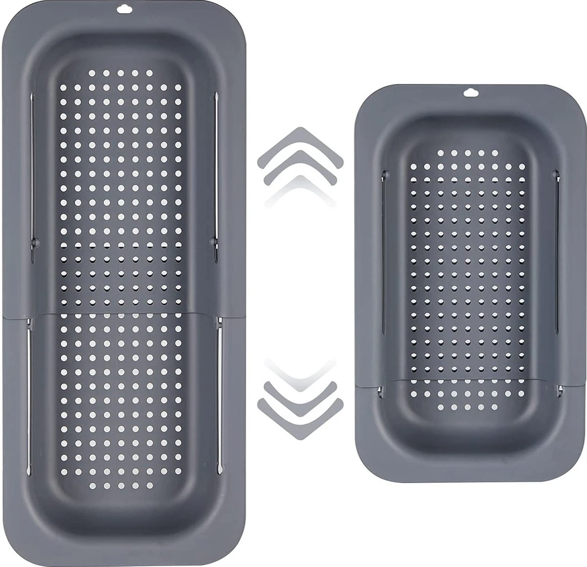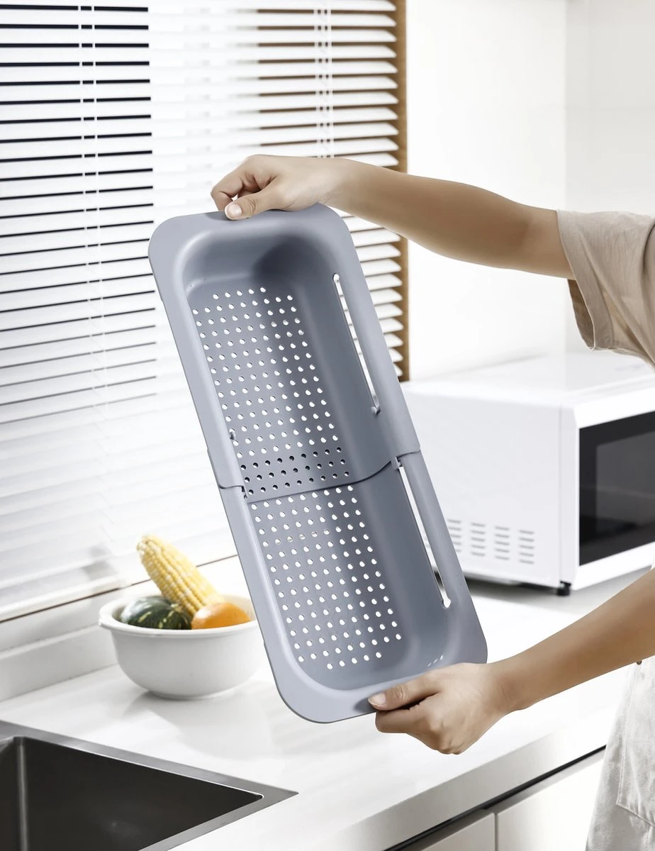 Zoekwoorden: Waterval gootsteenzeef uitschuifbaar vergiet keuken – Wassen groente en fruit – Afgieten pasta hulpmiddel Plastic PP Aftappen van groenten, fruit, schoonmaken van plastic afvoermand Over de gootsteen Vergietzeefmand