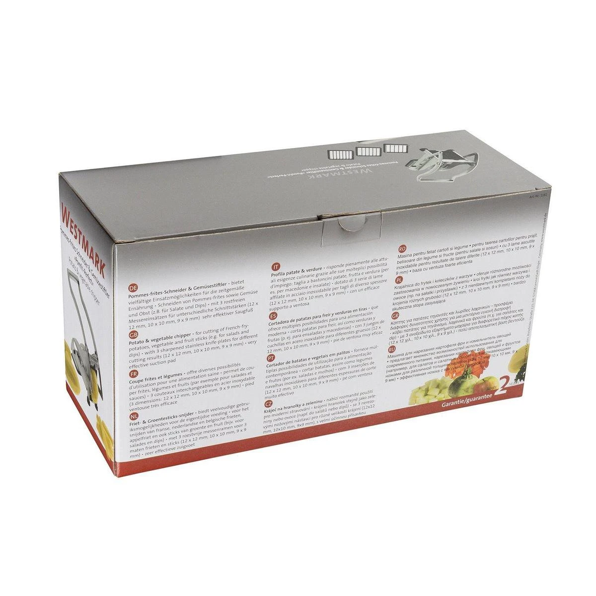 Maak zelf de lekkerste frietjes met deze handige Pomfri Perfect frietsnijder van Westmark. Deze krachtpatser heeft drie verwisselbare scherpe messenramen. De echte Hollandse frietjes maak je met het mes 10 x 10 mm, de Franse frietjes bereid je met de messen van 9 x 9 mm en voor de bekende Belgische frieten gebruik je het mes met de afmeting van 12 x 12 mm. Of je nu gek bent op dunne of dikke frieten, met deze frietsnijder maak je iedere variant in één handomdraai. Ook voor het maken van wortel- of fruitsticks voor een feestje is deze snijder perfect te gebruiken. De frietsnijder is gemaakt van een duurzame kunststof behuizing en heeft RVS messen. Voor reiniging wordt aangeraden de messen af te spoelen met warm water en een sopje. De afmeting van deze frietsnijder is 24,5 x 9,5 x 12,8 cm.
