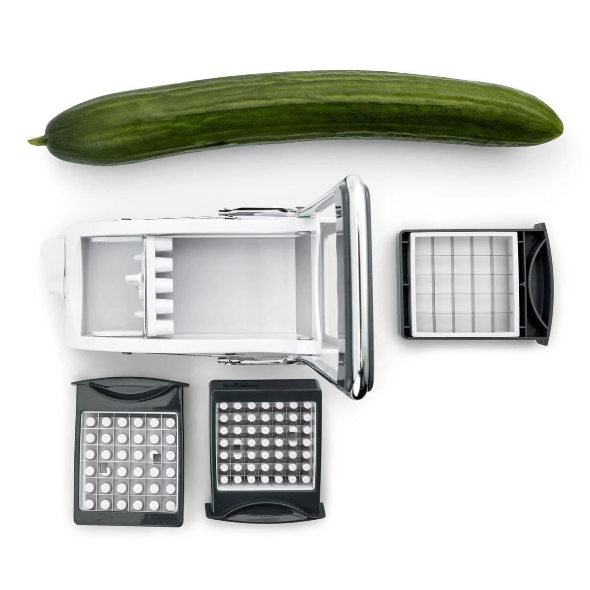 Maak zelf de lekkerste frietjes met deze handige frietsnijder van Westmark. Deze krachtpatser heeft drie verwisselbare scherpe messenramen. De echte Hollandse frietjes maak je met het mes 10 x 10 mm, de Franse frietjes bereid je met de messen van 9 x 9 mm en voor de bekende Belgische frieten gebruik je het mes met de afmeting van 12 x 12 mm. Of je nu gek bent op dunne of dikke frieten, met deze frietsnijder maak je iedere variant in één handomdraai. Ook voor het maken van wortel- of fruitsticks voor een feestje is deze snijder perfect te gebruiken. De frietsnijder is gemaakt van een duurzame kunststof behuizing en heeft RVS messen. Voor reiniging wordt aangeraden de messen af te spoelen met warm water en een sopje. De afmeting van deze frietsnijder is 24 x 8,5 x 11 cm.