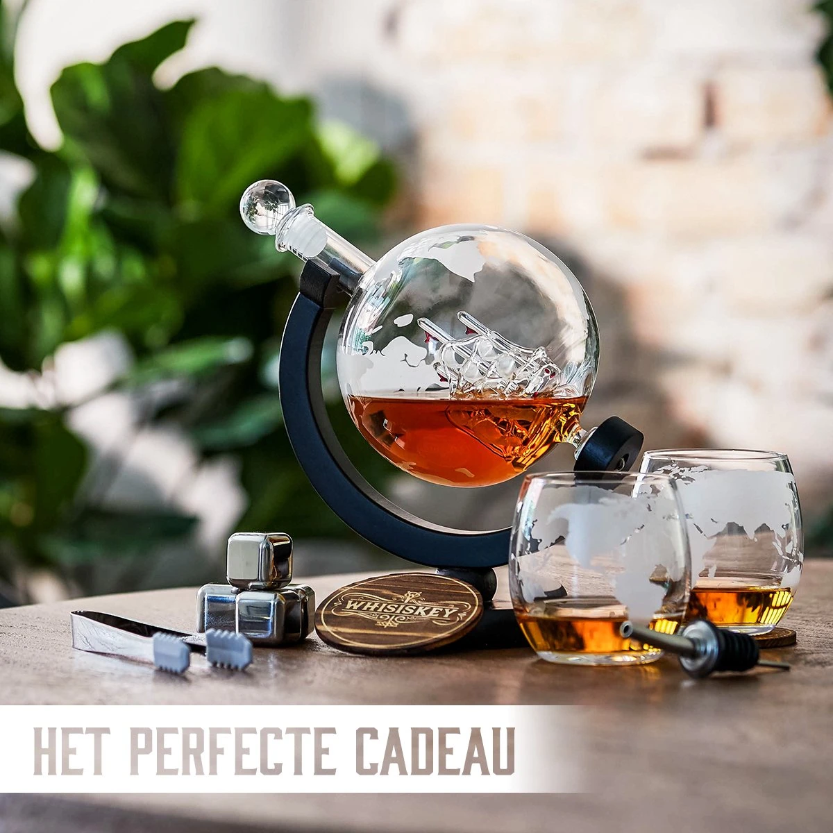 Begin jouw whiskey avontuur nog voor de eerste slok met deze unieke whiskey karaf. Deze wereldbol karaf van Whisiskey is met zijn luxe en chique uitstaling de eyecatcher die jouw interieur verdient. Daarnaast is deze whiskey karaf set van hoogwaardig handgeblazen glas met unieke details het ideale cadeau voor de whiskey liefhebber!