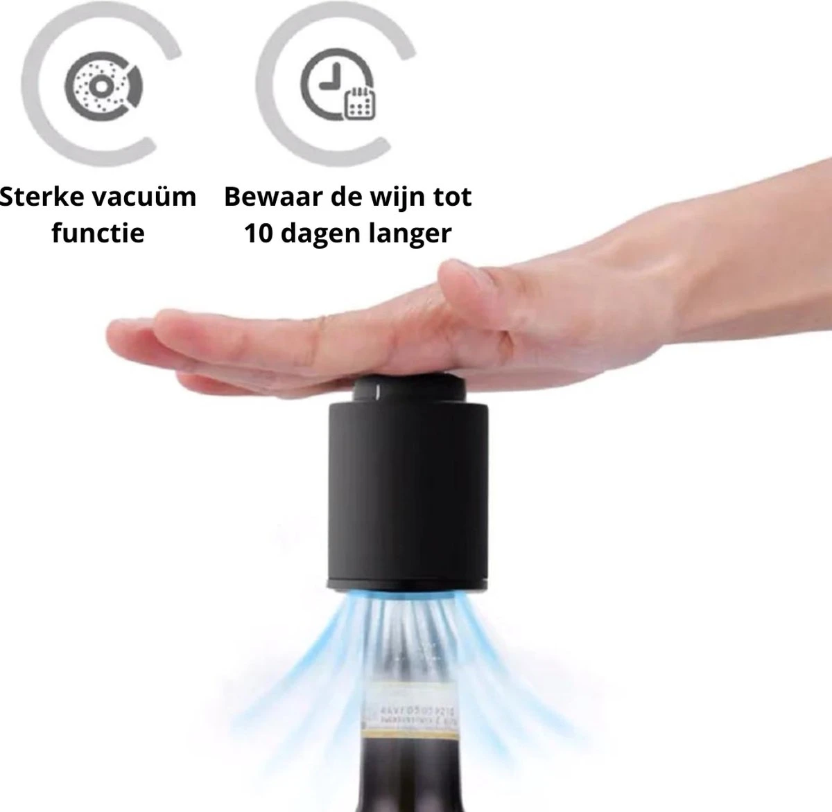 Behoudt langer aangebroken flessen wijn met deze vacuüm wijnstopper! De van hoge kwaliteit gemaakte en duurzame wijnstopper houdt wijn beter vers dan een kurk of een standaard wijnstopper. Doordat hij vacuüm zuigt wordt het oxidatieprocess van de wijn vertraagt. Hierdoor behoudt de wijn dezelfde smaak en is de aangebroken fles weken houdbaar in plaats van dagen. Met deze wijnstopper geniet je dus gerust op een later moment opnieuw van je wijn! Ook te gebruiken voor flessen champagne.