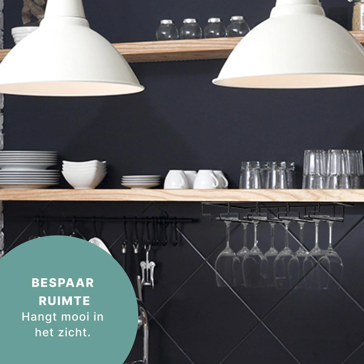 Het wijnglazenrek is onder elke (rechte) plank of keukenkastje te bevestigen. Je kunt er zelf voor kiezen of je de glazen als eyecatcher in het zicht wilt hangen of gewoon in je keukenkastje.