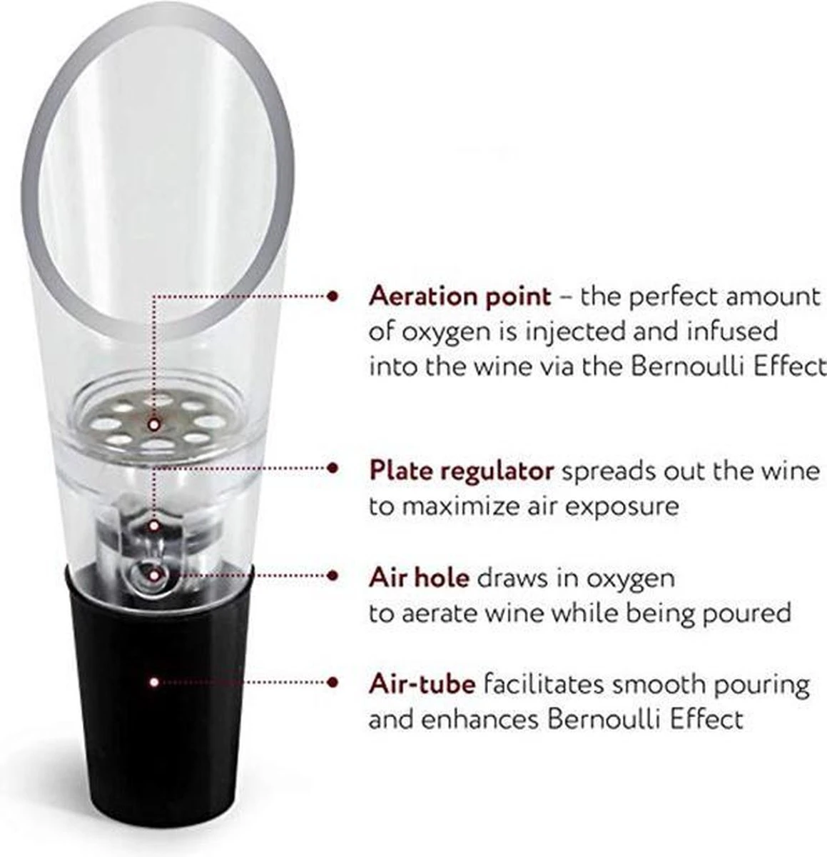 De decanteerder zorgt voor een ultieme smaak sensatie. Tijdens het schenken wordt de wijn extra voorzien van de juiste hoeveelheid zuurstof voor een krachtige smaak van de wijn. De rubberen hals van de wijnbeluchter past om elke fles wijn. ontzettend fijn hulpmiddel om wijn in te schenken zonder hierbij te druppelen. Daarnaast geeft het een leuke en nette uitstraling.