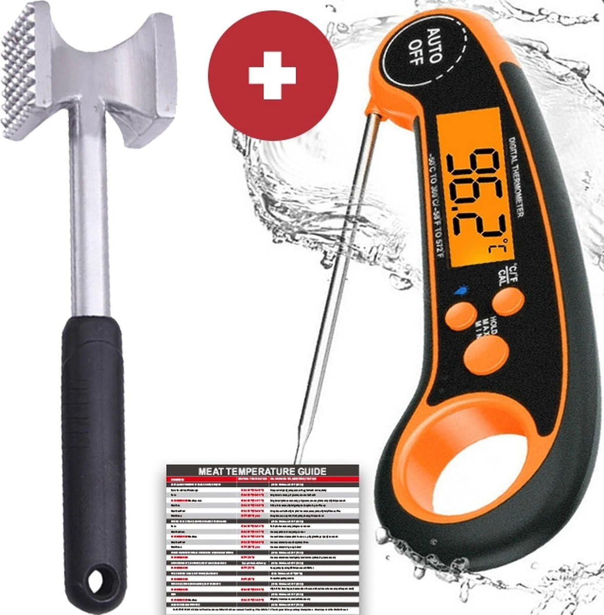 Het lekkerste gerecht bereid je met deze combi YUGN Thermometer en YUGN Vleeshamer. Een razendsnelle thermometer en een stevige vleeshamer.