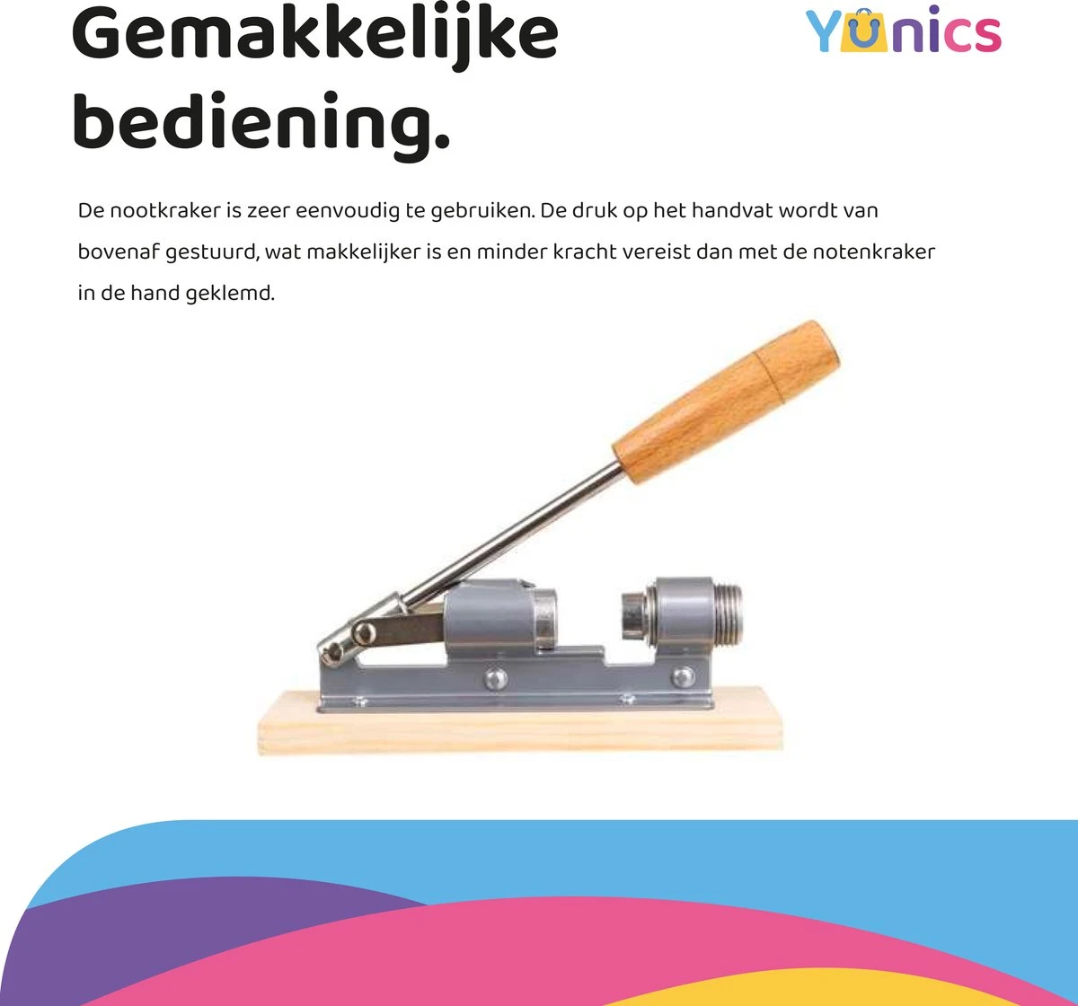 De YUNICS notenkraker is zeer eenvoudig te gebruiken. De druk op het handvat wordt van bovenaf gestuurd, wat makkelijker is en minder kracht vereist dan met de notenkraker in de hand geklemd.